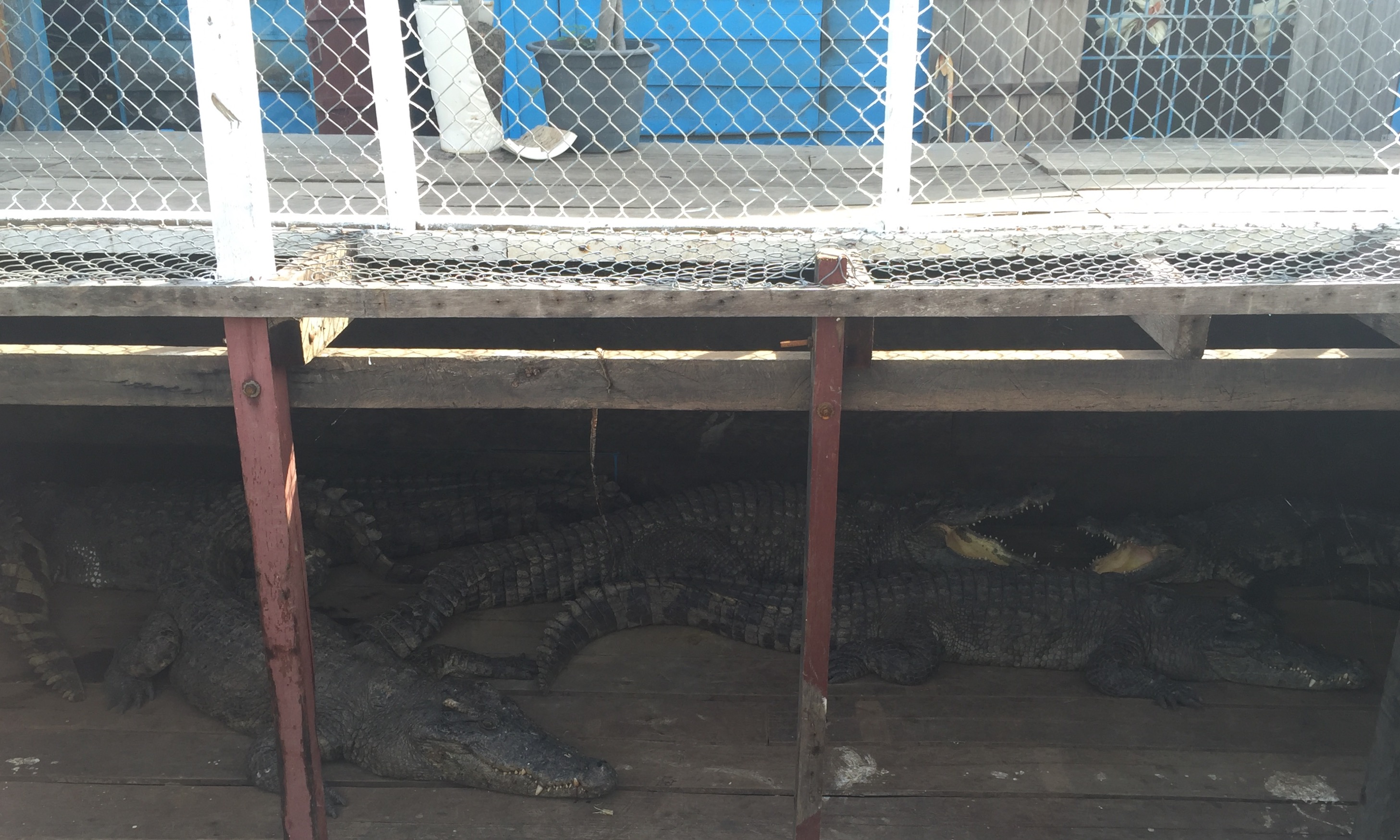途中で寄った水上民芸品店の床下では、ワニを飼っていたりもします。