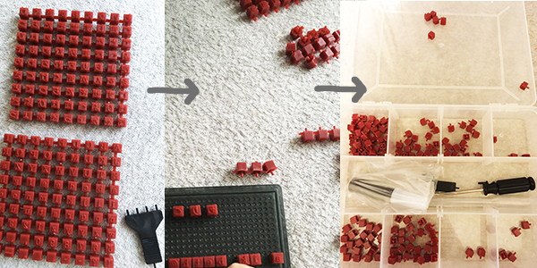 アルファベットの小文字、大文字、平仮名、濁点、記号などを分けないと探すのが大変だったので、100均へ行き仕切りケースを買って来て整理しました。