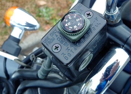 オートバイは言わずもがな、鉄が使われており方位磁石は狂うので、磁石に干渉しない箇所を見つけることが肝要です。自分のバイクはここが一番良いポジションでありました。