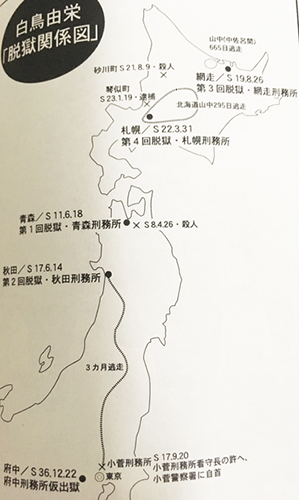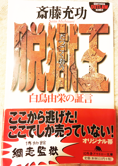 皆さまご存知かもしれませんが『破獄』や『脱獄王』という名前で白鳥由栄をモデルにした小説、ドラマや映画も作られています。それらはどれも良いのですが、実名で本人の証言を得て、一番忠実にその人物について書かれているのは下記、幻冬舎「アウトロー」文庫の一冊。この本は網走刑務所でしか売っていないそうで、網走へ旅行に行った知人から借りたのですが、幾つかヤフオクへ出品されているのを見つけたので自分でも落札。これを読み、少々邪推かもしれませんが、当時の新聞や警察の記録と本人からの証言や実際の年齢等でいくつか食い違う部分もあり、記録や報道については誇張や隠ぺいの片鱗を垣間見たような気がいたしました。公的機関と報道はいつの時代も変わらない、ということでしょうかね…。